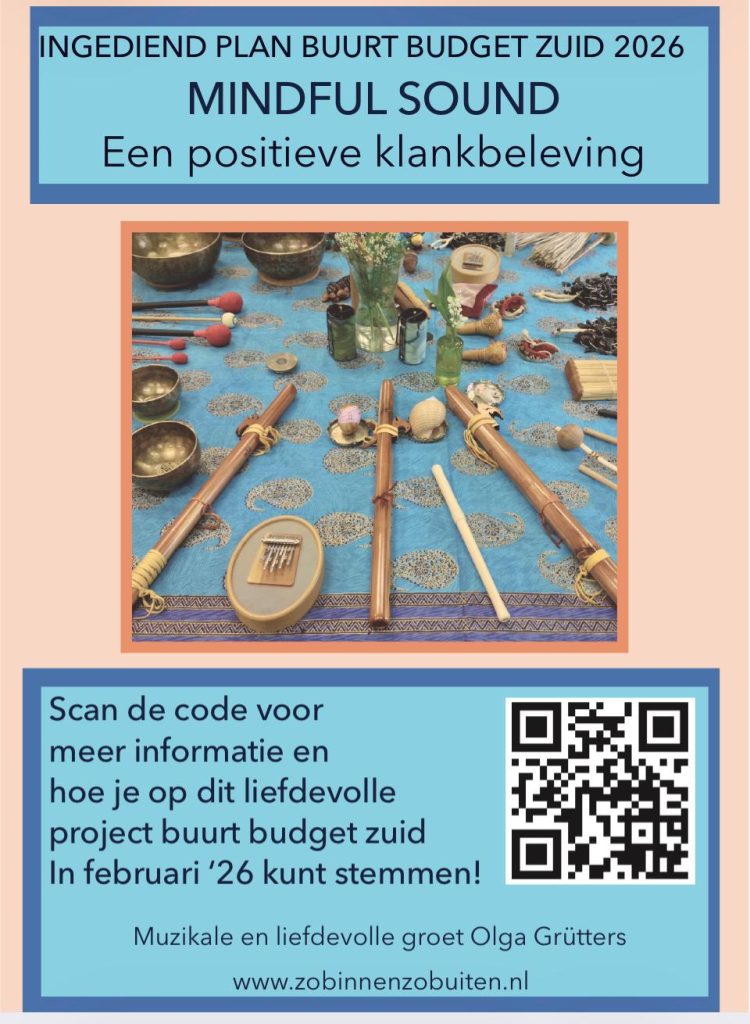 Beste bezoeker, welkom op mijn site. Je kan op de flyer de informatie vinden voor mijn buurtbudget zuid plan Mindful Sound. Scan de QR code en je komt op de site van het budget plan van gemeente Amsterdam, waar mijn plan op staat. Mijn site wordt helemaal vernieuwd. Je kunt nog wel alle oude informatie bekijken maar de agenda is niet in werking.